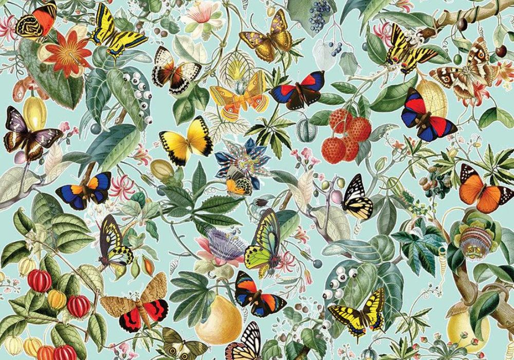Fluttery flapping butterflies flit around green leaves, fresh fruit, and fragrant flowers in this 1000 piece puzzle!