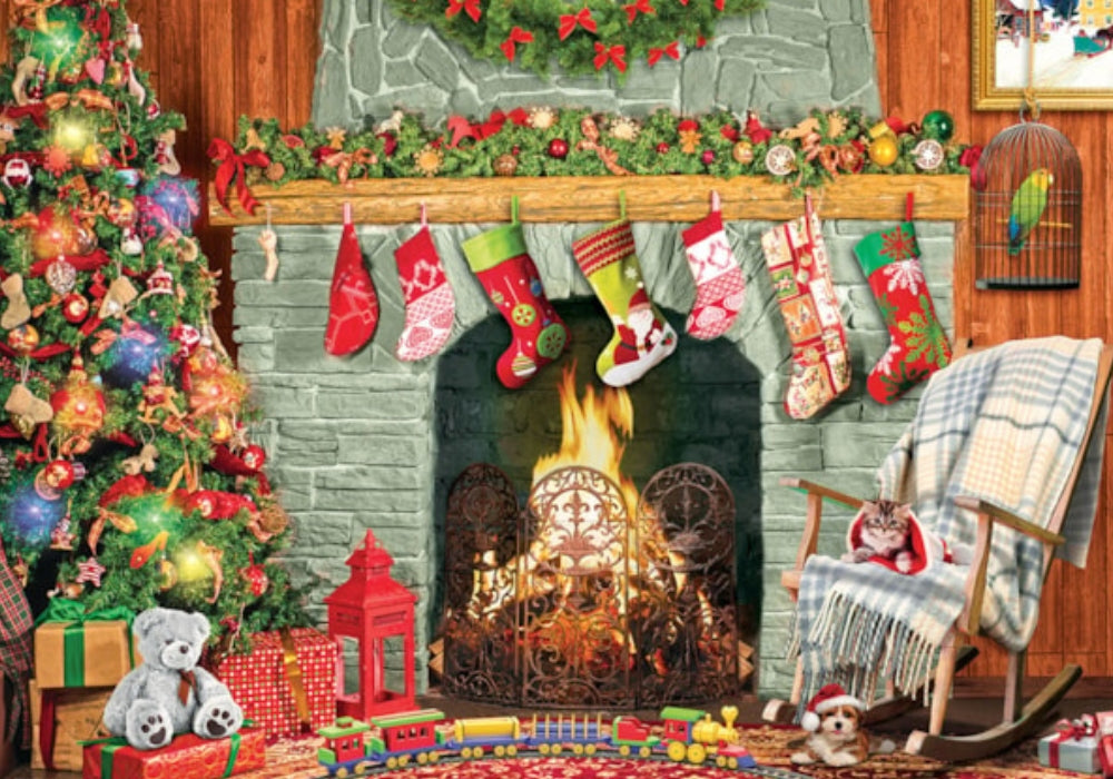 Holiday tradition with stockings hanging from the fireplace and festive tree adorned with lights and ornaments.