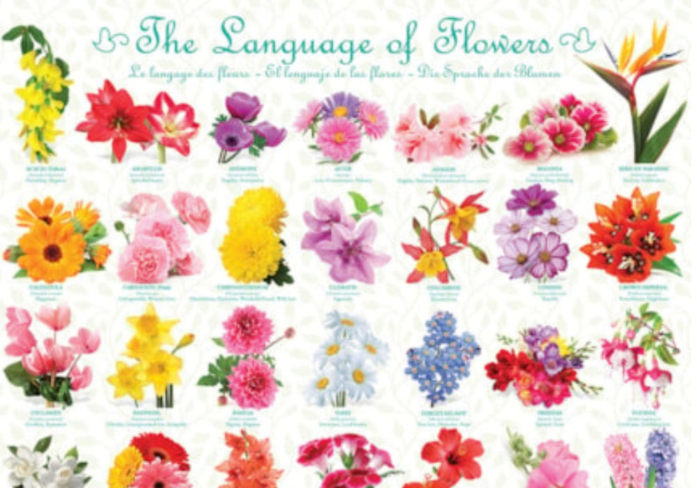 Take a moment to consider what a flower is capable of saying. Carnations for a woman's love, Irises for friendship, and Yellow Tulips for hopeless love. Over 45 flowers are featured in this beautiful image. Strong high-quality puzzle pieces. Made from recycled board and printed with vegetable based ink. This superior quality puzzle will delight and educate all at the same time.