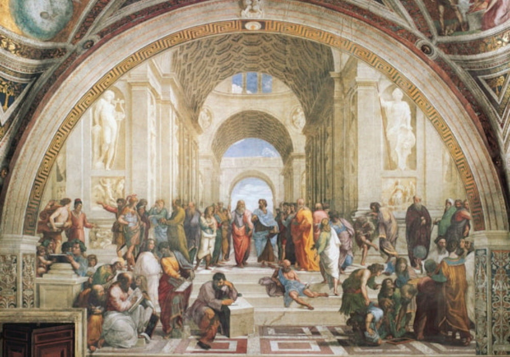 Raphael's masterpiece features the most famous philosophers of ancient times moving within an imposing Renaissance architecture. The list includes none other than Aristotle, Plato, Socrates, Pythagoras, Heracleitus, Diogenes and Ptolemy to name a few. Strong high-quality puzzle pieces. Made from recycled board and printed with vegetable based ink. This superior quality puzzle will delight and educate all at the same time.