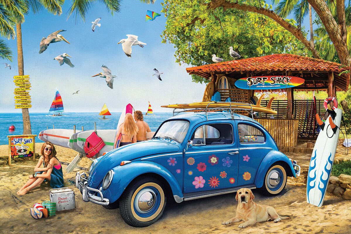 Pull up on the beach with your VW Beetle and surfboard to catch some waves. Grab a snack at the local snack shack and take a break.