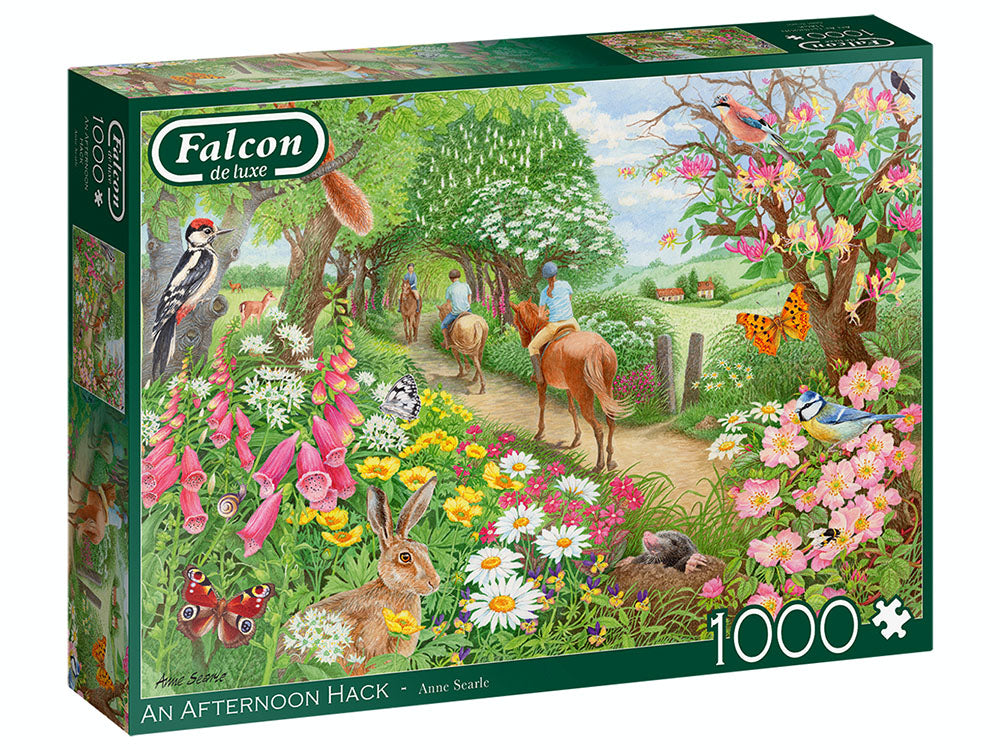 An Afternoon Hack is the title of this delightful 1000 piece Falcon de luxe jigsaw puzzle, which is part of the Falcon de luxe Scenery collection. The puzzle image presents a beautiful summers day in the park gardens, so perfect it would be rude not to enjoy this nice weather You can find friends taking a stroll on their horses through the stunning greenery, as well as furry friends all in one image. This picturesque 1000 piece jigsaw puzzle has been illustrated by the very talented artist, Anne Searle.