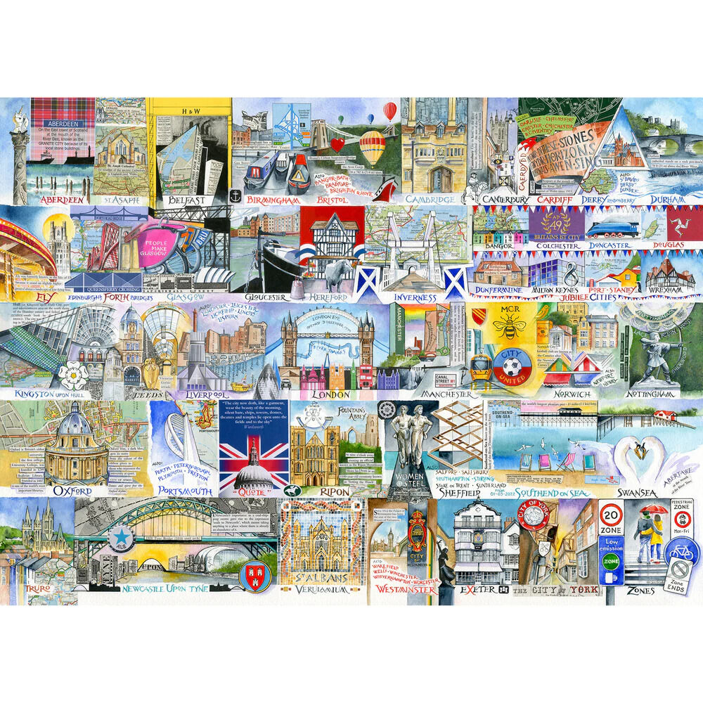 From Inverness to Truro, explore the cities of the United Kingdom in this 1000 piece jigsaw puzzle. Every city is bursting with its unique history and Val Goldfinch has worked her magic once again to illustrate a fascinating detail of each iconic place.