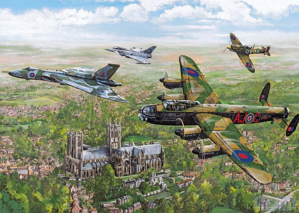 Soaring gracefully over Lincoln Cathedral, these four aircraft represent the significance of both past and present UK air defense. In this 1000-piece puzzle, the Lancaster and Spitfire break away from the formation, symbolising how past heroes make way for the Vulcan and the modern Typhoon, as the RAF's legacy continues.