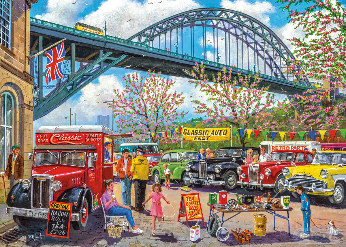 Explore the charm of London and the United Kingdom with Gibsons' nostalgic Newcastle jigsaw puzzle. Featuring iconic vehicles from the past, this 1000-piece puzzle by artist Derek Roberts is perfect for puzzle enthusiasts and makes a unique gift. Measuring 26.77" x 19.29" when completed, this intricately cut puzzle provides a satisfying experience for ages 11 and up. Take a trip down memory lane with Newcastle.