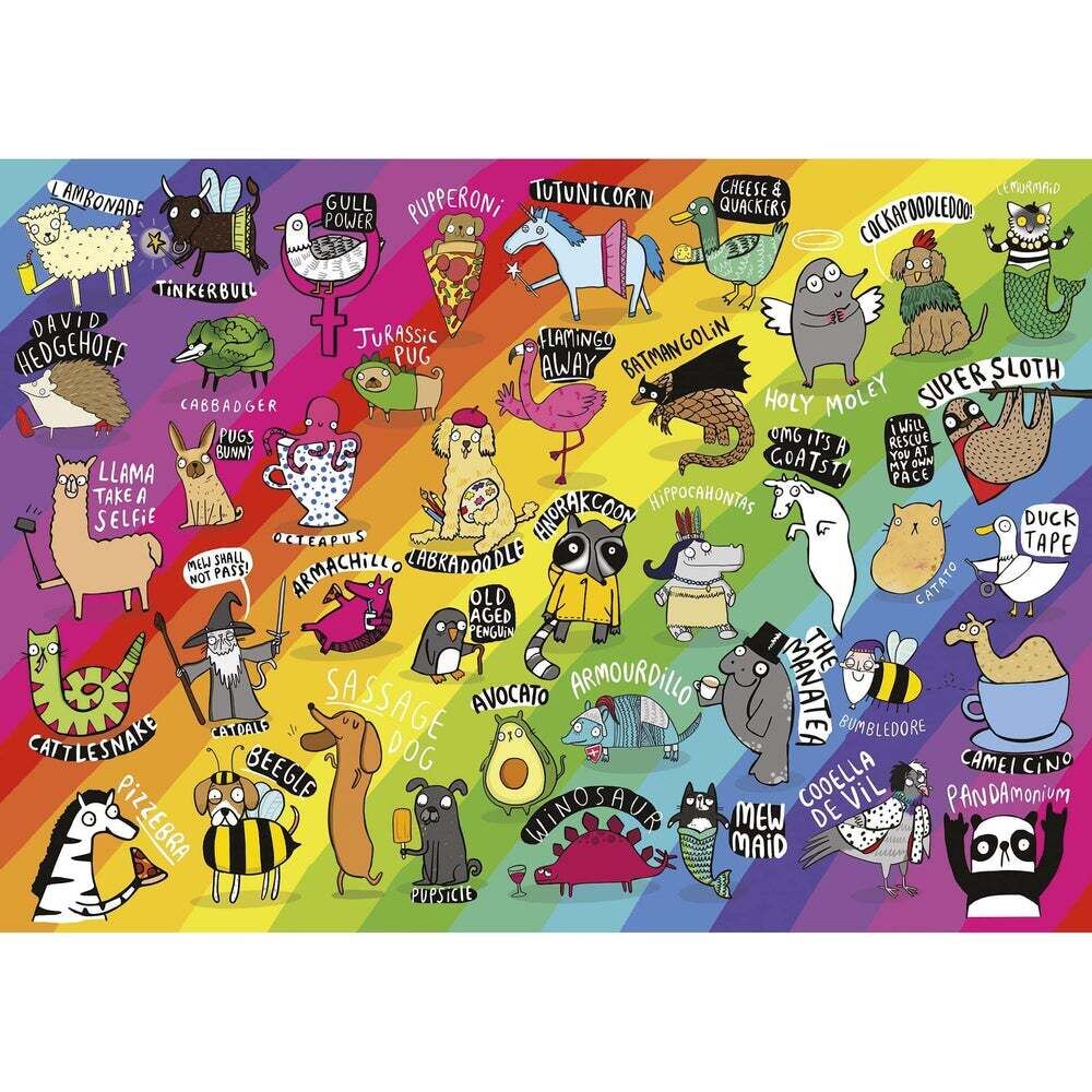Holey Moley! Punimals is a vibrant, hilarious mix of Winosaurs, Pupsicles, and Armachillos. Tell the world to FlaminGo Away as you assemble the quirky hybrids like Bumbledore, David Hedgehoff, and Anarakoon in this 500-piece jigsaw puzzle.