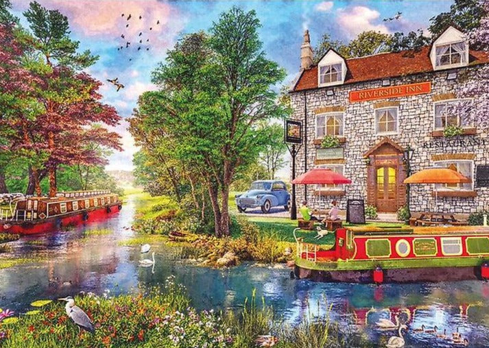 Experience the tranquil beauty of the Riverside Inn with this 1000-piece jigsaw puzzle. Painted by artist Dominic Davison, it captures a peaceful spring day with blooming blossom trees and ducklings floating down the river. Made by Gibsons, known for their high quality and challenging puzzles, this one is perfect for puzzle enthusiasts worldwide.