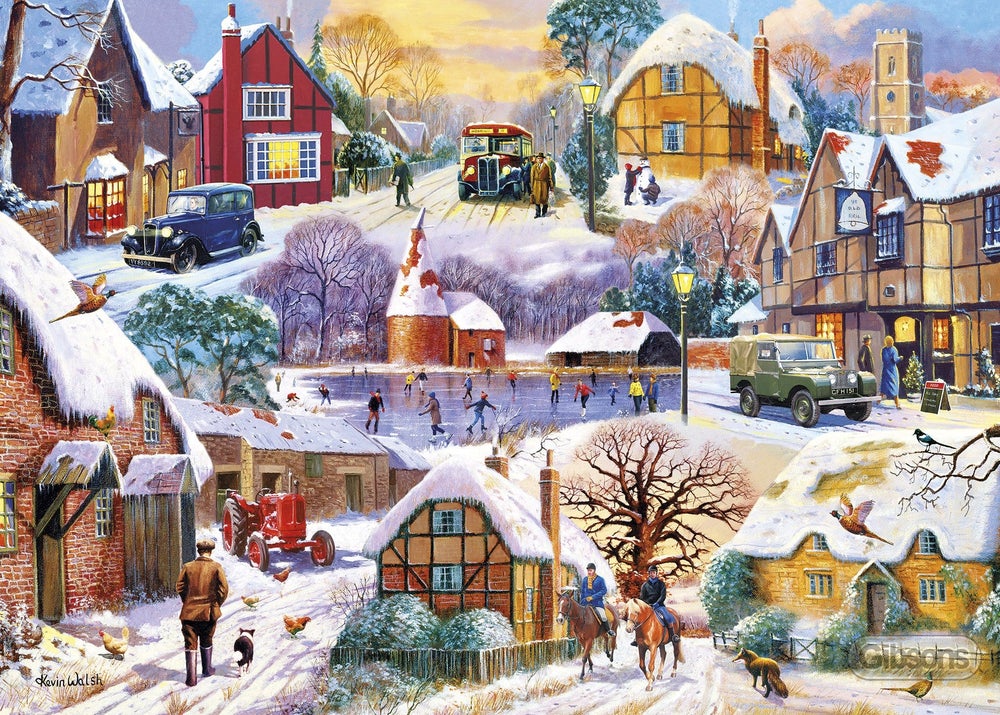Experience peace and nostalgia with Gibsons' "Winter Cottages" puzzle. Assemble the 1000 pieces painted by artist Kevin Walsh and escape to a picturesque village blanketed in snow. Each purchase supports artists worldwide and uses eco-friendly materials. Create a tranquil moment with this premium puzzle.