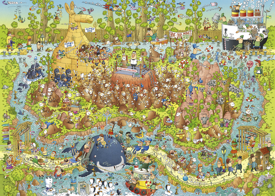 In the Heye puzzle, Australian Habitat, a comical depiction of an Australian zoo is illustrated. In this Marino Degano cartoon, people come to the funky zoo to see what Australia's wildlife has to offer. The animals in this image include, penguins, whales, birds, koalas, and of course, kangaroos. All Heye jigsaws are manufactured in dust-reduced production and come in merchandising-friendly packing. The Heye Puzzle Company was founded in the year 1962, by Friedrich Wilhelm Heye. They specialize in creating the highest quality jigsaw puzzles available.