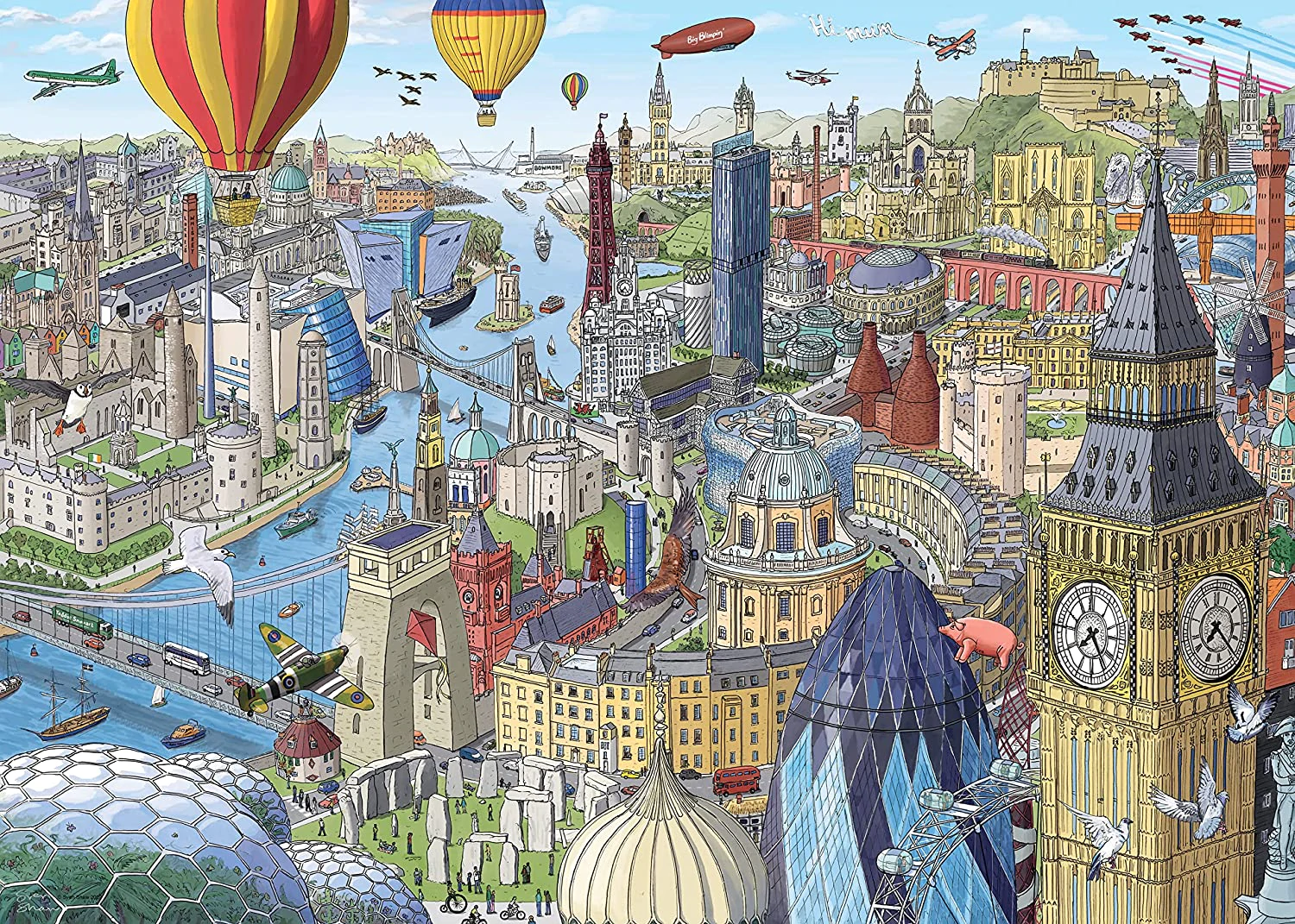 This fabulous puzzle shows locations encompassing 5000 years of history. From ancient sites Stonehenge and the Rock of Cashel, to architectural wonders Portmeirions Bell Tower and Oxfords Radcliffe Camera, and onto contemporary structures like Titanic Belfast and the Falkirk Wheel, there's so much to discover and enjoy. Youll also find a world-famous flying team, a cheeky skywriter, a legendary pop group and a flying pink pig! Includes in-box key showing locations, extra puzzle picture for easy reference and artist information.