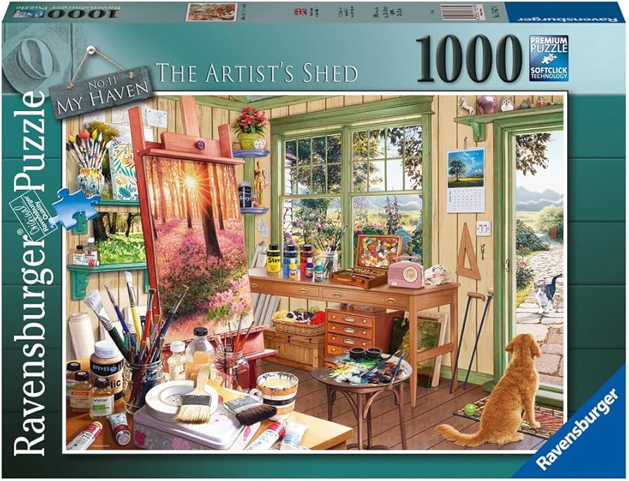 Nestled in the charming atmosphere of an artist's shed, this 1000-piece puzzle captures a unique allure as every detail of the scene comes to life. A faithful dog stands at the open door, gazing out with a mix of curiosity and loyalty. Beneath the desk, a serene cat curls up in a cozy basket, embodying calm amid the vibrant energy of creativity. The cat's presence mirrors the shed's tranquil ambiance, a space where imagination flourishes. An easel holds a partially completed canvas, while paintbrushes, flecked with colors from past projects, rest in jars. As each puzzle piece finds its place, a sense of wonder and achievement grows, inviting you into the artist's world. With the final piece in place, the puzzle transforms into a portal to the heart of the shed—an inspiring haven filled with warmth, creativity, and the quiet companionship of a dog and a cat.